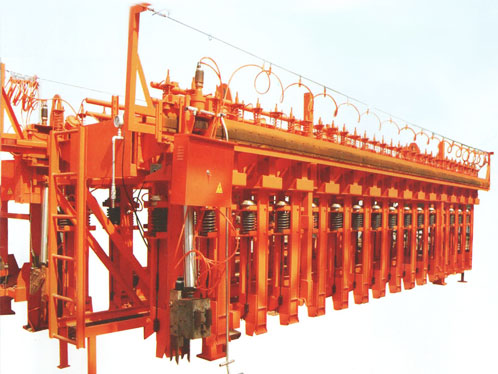 (7) 緩慢放下母線提升機框架,順槽上部結構上的導向軌下放提升機,確認32組陽極導桿端部進入32組陽極夾具內,再下放母線提升機框架至座穩于電解槽上部結構上。